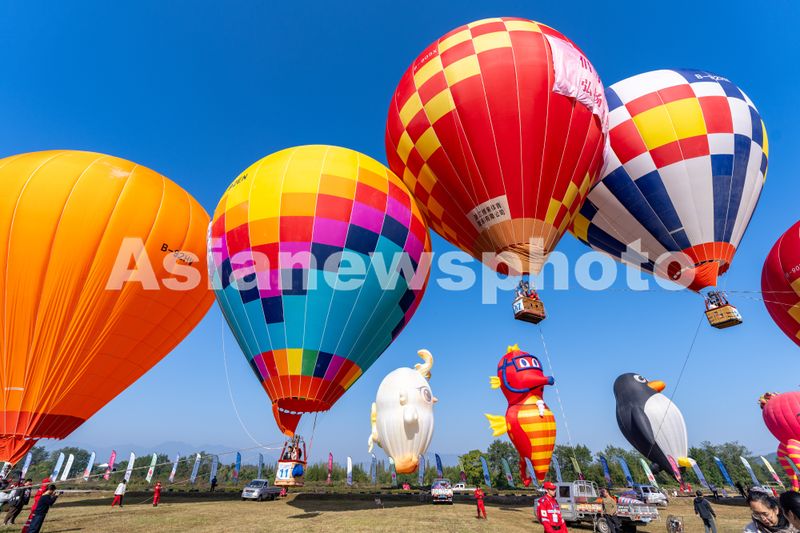 图片说明:2025年11月22日,浙江金华,武义县大斗山飞行营地,青年男女正在参加热气球浪漫集体婚礼。