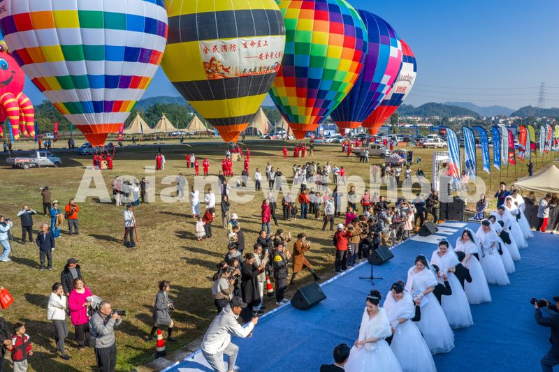 图片说明:2025年11月22日,浙江金华,武义县大斗山飞行营地,青年男女正在参加热气球浪漫集体婚礼。