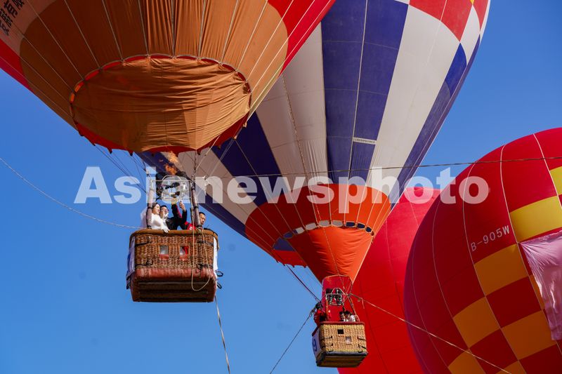 图片说明:2025年11月22日,浙江金华,武义县大斗山飞行营地,青年男女正在参加热气球浪漫集体婚礼。