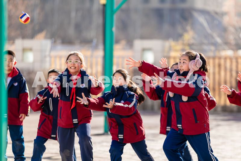 2025年11月25日,内蒙古呼和浩特市玉泉区石东路小学的学生在操场上玩打沙包。
