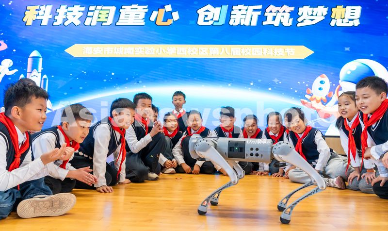 2025年11月26日,江苏省海安高新区实验小学的学生们在校园科技节上观看智能机器狗表演。