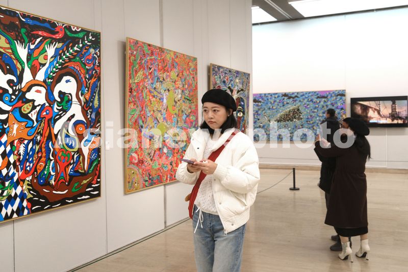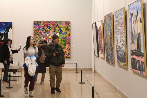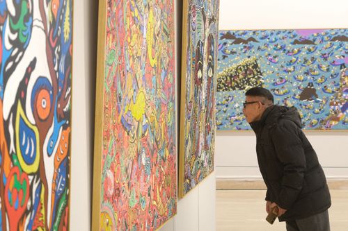 2025年11月26日,观众在北京观看由浙江省美术家协会、中共舟山市委宣传部等单位主办的“海上的乡土世界——新时代舟山渔民画艺术作品展”。