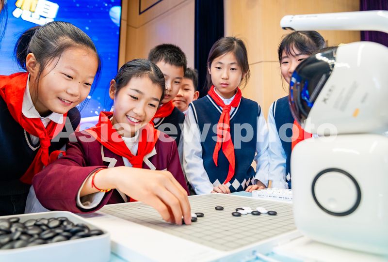 2025年11月26日,江苏省海安高新区实验小学的学生们在校园科技节上与AI机器人进行棋类对弈。