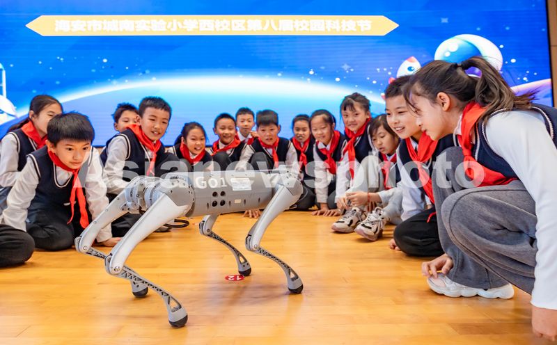 2025年11月26日,江苏省海安高新区实验小学的学生们在校园科技节上观看智能机器狗表演。