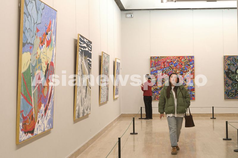 2025年11月26日,观众在北京观看由浙江省美术家协会、中共舟山市委宣传部等单位主办的“海上的乡土世界——新时代舟山渔民画艺术作品展”。