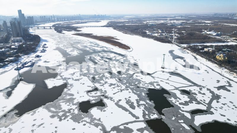 图片说明:雪后哈尔滨市道里区与松花江黑白相间的美景(无人机照片)。