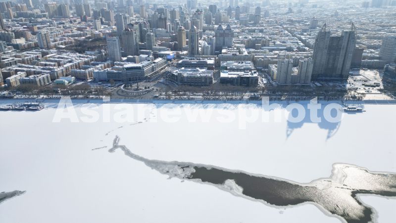 图片说明:雪后哈尔滨市道里区与松花江黑白相间的美景(无人机照片)。