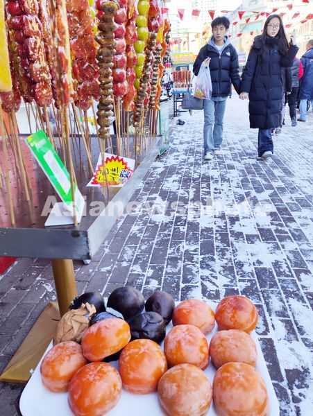 图片说明:哈尔滨市道里菜市场外,大冻梨冻柿子亮相。