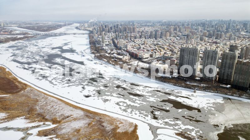 图片说明:雪后哈尔滨市道里区与松花江黑白相间的美景(无人机照片)。