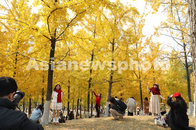 图片说明:2025年11月29日,游客在位于重庆市两江新区的重庆中央公园的银杏美景前留影。