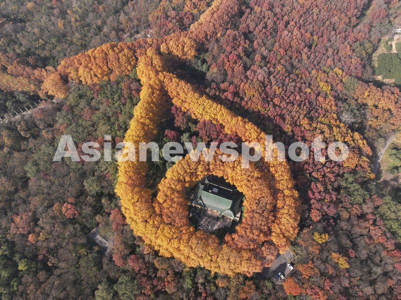 2025年11月30日,江苏省南京市,钟山风景名胜区层林尽染,美龄宫犹如一颗镶嵌在“金色项链”末端的宝石,风景如画,美不胜收。