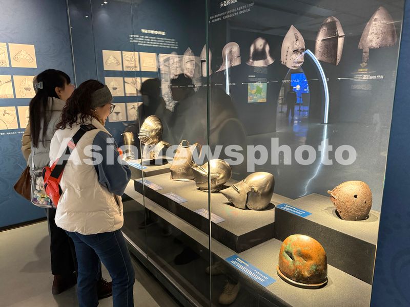 2025年12月2日,在南京城墙博物馆举办的“欧洲骑士盔甲与文化展”展厅,包括留下明显战斗痕迹的各式头盔吸引观众。