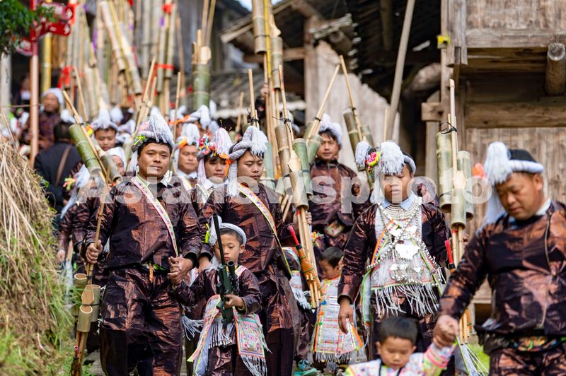 2025年12月8日,贵州从江县丙妹镇岜沙苗寨,芦笙手扛着芦笙赶赴芦笙堂。