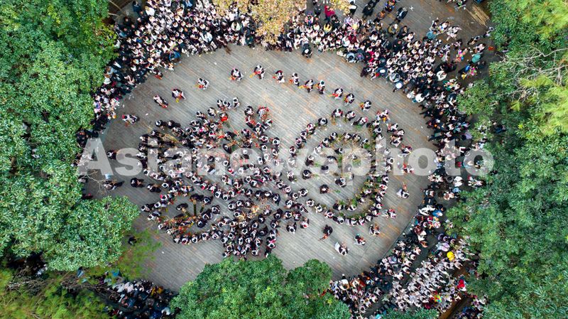 2025年12月8日,贵州从江县丙妹镇岜沙苗寨,芦笙手在进行芦笙踩堂(无人机照片)。