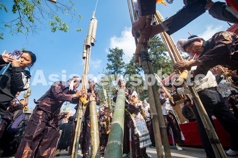 2025年12月8日,贵州从江县丙妹镇岜沙苗寨,芦笙手在吹奏芦笙。