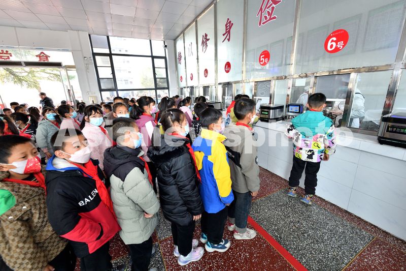12月10日,在湖北省襄阳市保康县歇马镇小学食堂,学生在排队打饭。