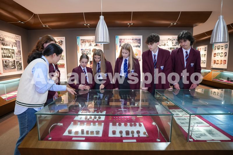 图片说明:2025年12月10日,福建省福州市仓山区,福建师范大学附属中学的师生陪同英国友好学校的师生参观校史展馆。