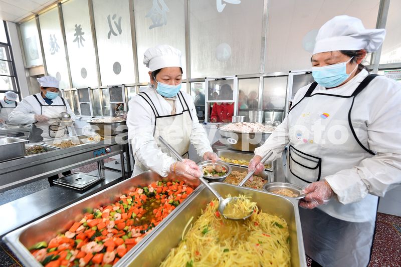 12月10日,在湖北省襄阳市保康县歇马镇小学食堂,厨师们给学生盛饭菜。