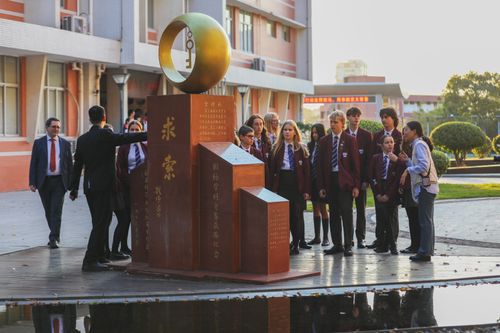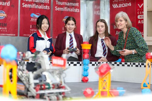 图片说明:2025年12月10日,福建师范大学附属中学的学生和英国友好学校的师生体验机器人。