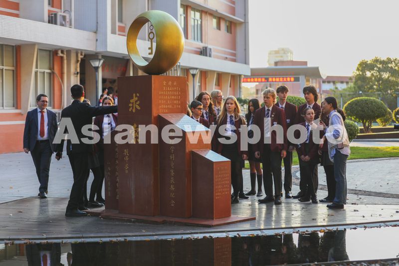 图片说明:2025年12月10日,福建省福州市仓山区,福建师范大学附属中学的师生陪同英国友好学校的师生参观校园雕塑。