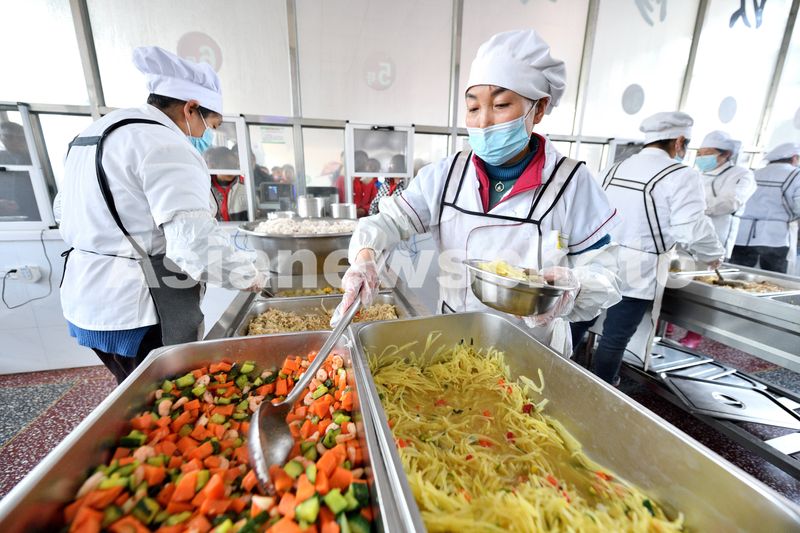 12月10日,在湖北省襄阳市保康县歇马镇小学食堂,厨师们给学生盛饭菜。