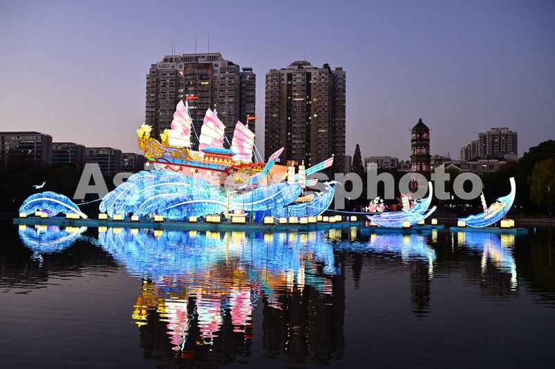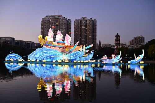 2025年12月15日晚,浙江义乌市绣湖广场、绣湖公园处处张灯结彩,《八骏图》、《潮涌商都 帆启新程》等大型灯组陆续开启亮灯模式,喜迎新年到来。