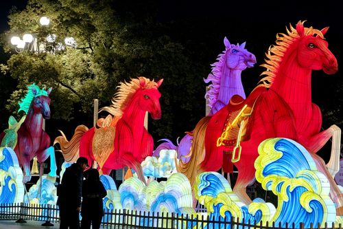 据义乌市建设局园林绿化处工作人员介绍,2026年绣湖灯会分两大区域,其中绣湖广场灯会造型围绕“策马奔腾 盛世华章”主题,绣湖公园灯会造型围绕“家和岁韵 福满商城”主题,共计有10组大中型特色灯组隆重展出。
