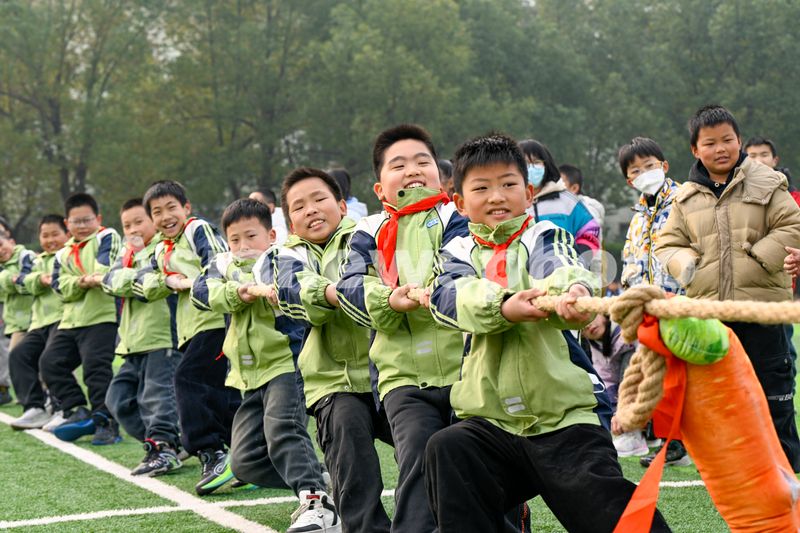 2025年12月17日,在安徽省合肥市庐阳区五一小学操场,小学生们正在参加趣味运动会拔河比赛。