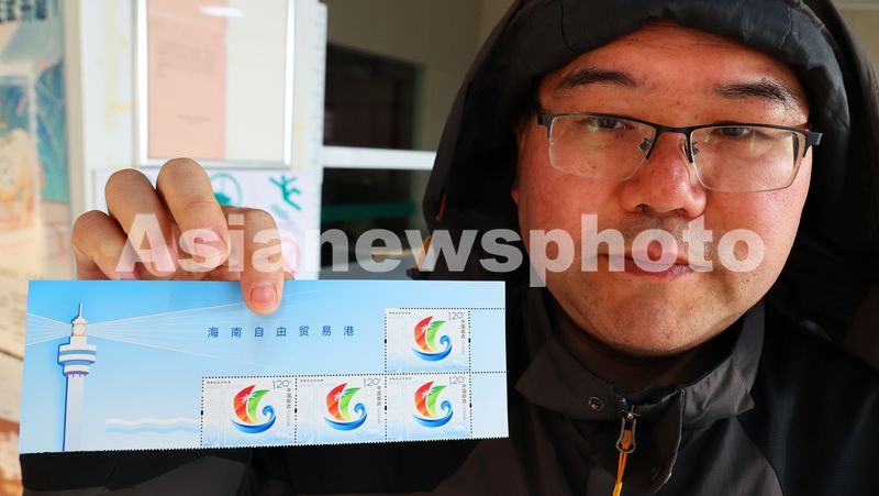 2025年12月18日,在江苏省连云港市海州区苍梧路集邮旗舰店,集邮爱好者正在展示《海南自由贸易港》特种邮票。