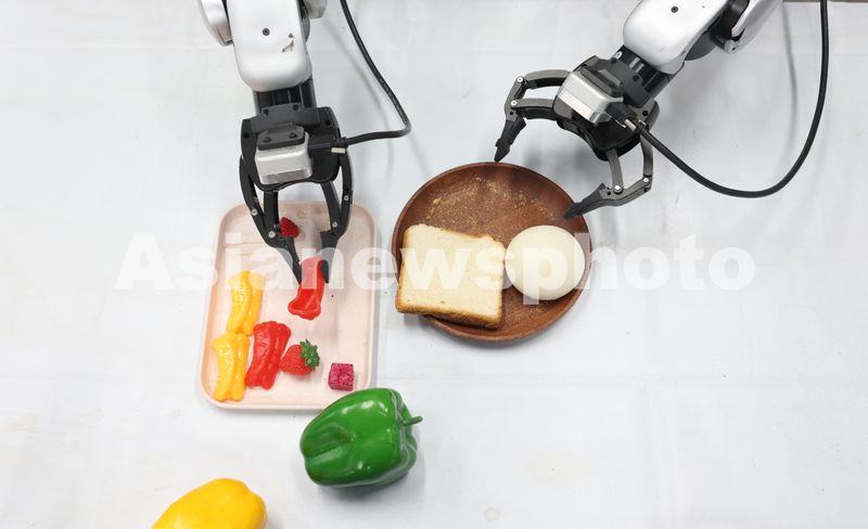 11月27日,在北京人形机器人数据训练中心厨房场景,机器人在抓取食物。