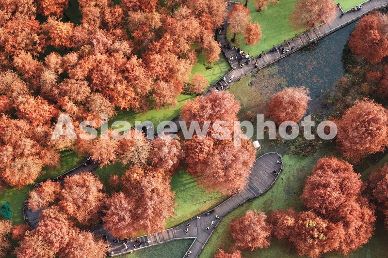 2025年12月22日,游客在杭州青山湖水上森林公园游览观光。近日,杭州青山湖水上森林公园近百亩池杉、落羽杉迎来最佳观赏期,火红的水上森林与水面碧绿的浮萍相映成景,如画般的冬日美景吸引游客纷至沓来。(实习编辑 华俣涵)