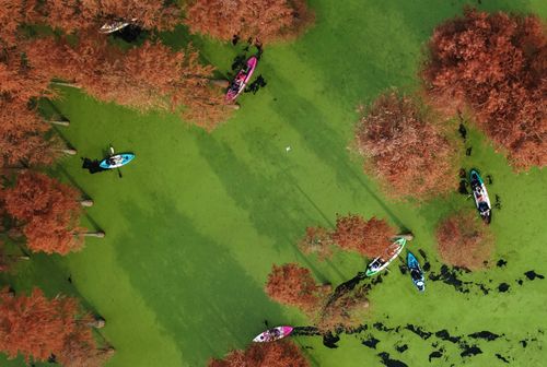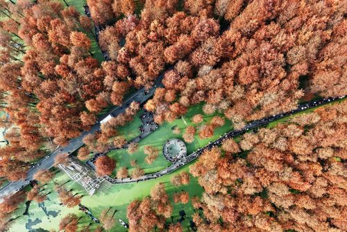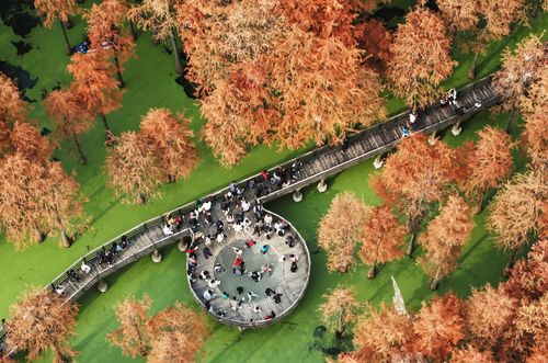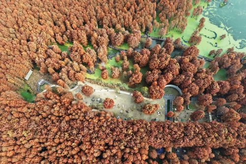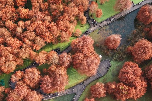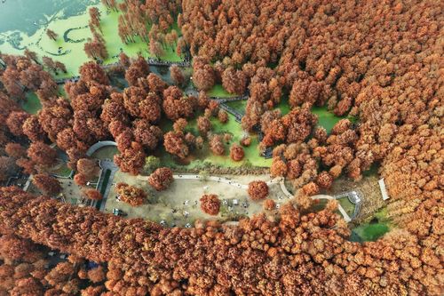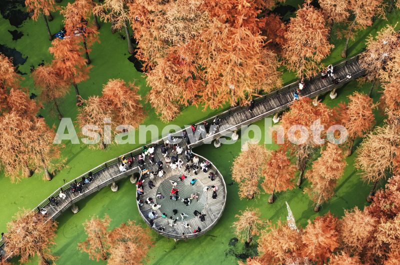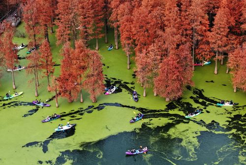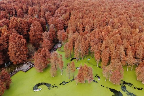 2025年12月22日,游客在杭州青山湖水上森林公园游览观光。近日,杭州青山湖水上森林公园近百亩池杉、落羽杉迎来最佳观赏期,火红的水上森林与水面碧绿的浮萍相映成景,如画般的冬日美景吸引游客纷至沓来。(实习编辑 华俣涵)