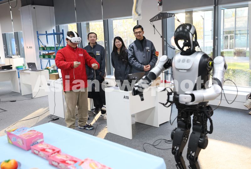 11月27日,在北京人形机器人数据训练中心,工作人员互相交流如何更好的操控人形机器人动作展示。
