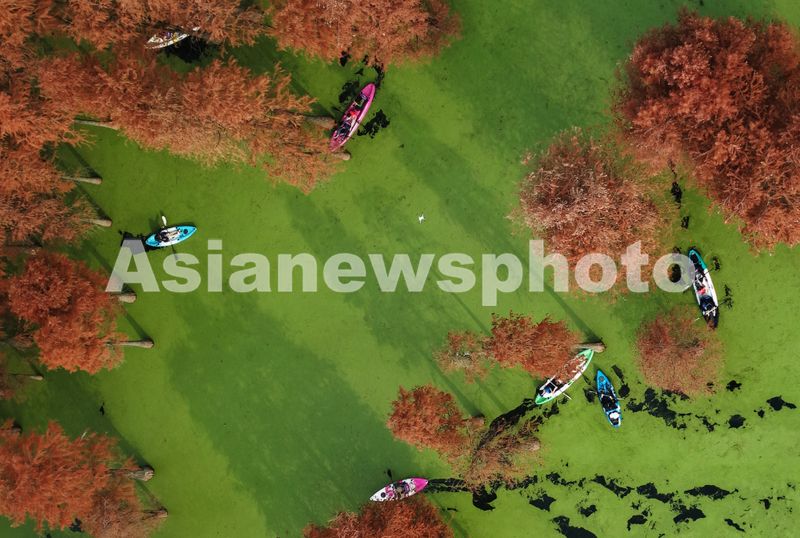 2025年12月22日,游客在杭州青山湖水上森林公园游览观光。近日,杭州青山湖水上森林公园近百亩池杉、落羽杉迎来最佳观赏期,火红的水上森林与水面碧绿的浮萍相映成景,如画般的冬日美景吸引游客纷至沓来。(实习编辑 华俣涵)