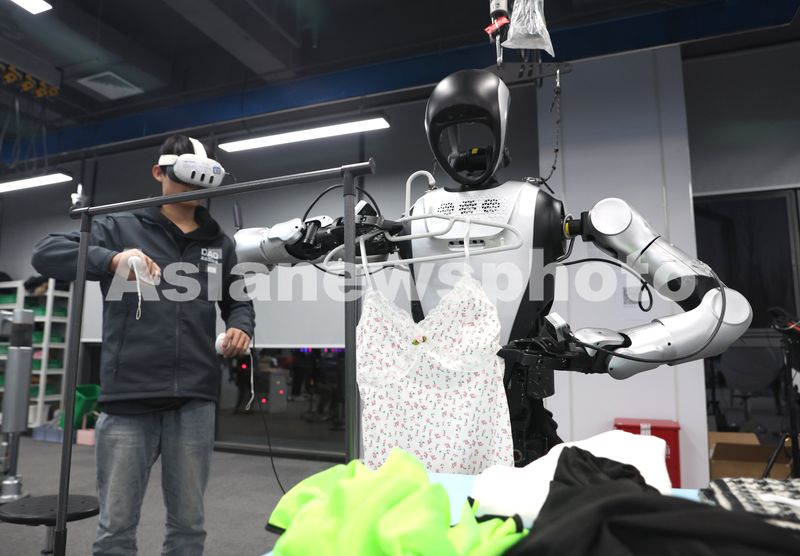 12月20日,在北京人形机器人数据训练中心生活服务场景,来自首钢工学院计算机应用技术专业的邵俊滕(左)在训练机器人将连衣裙挂在晾衣架上。