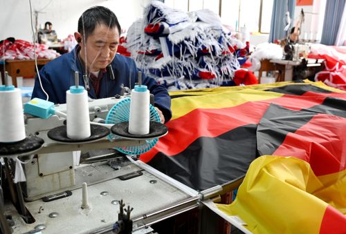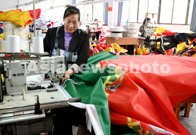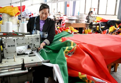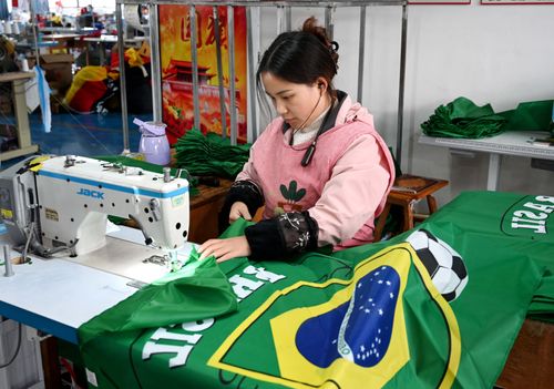 2025年12月22日,浙江省金华市武义县金力球迷用品有限公司缝纫车间马达飞转,员工开足马力生产参赛球队的国旗和球迷用品。