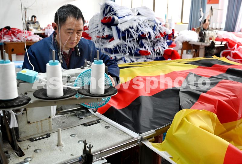 2025年12月22日,浙江省金华市武义县金力球迷用品有限公司缝纫车间马达飞转,员工开足马力生产参赛球队的国旗和球迷用品。