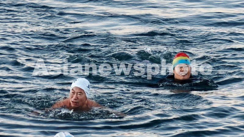 当日清晨,大连市冬泳协会虎滩新区冬泳队,在中山区石槽风景区海滨浴场,开展“冬游大连,奋‘泳’向前”为主题的冬泳嘉年华活动。17名队员当中最大年龄84岁,最小年龄50岁。他们无畏严寒,在冰冷刺骨的海水中畅游大海,享受冬泳带来的健康和快乐。
