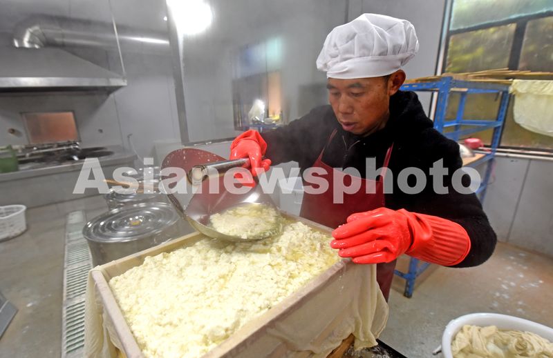 2025年12月25日,浙江省台州市仙居县上张乡活壹豆制品加工小作坊,村民正在制作当地特产——盐卤豆腐。