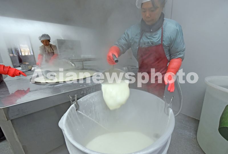 2025年12月25日,浙江省台州市仙居县上张乡活壹豆制品加工小作坊,村民正在制作当地特产——盐卤豆腐。
