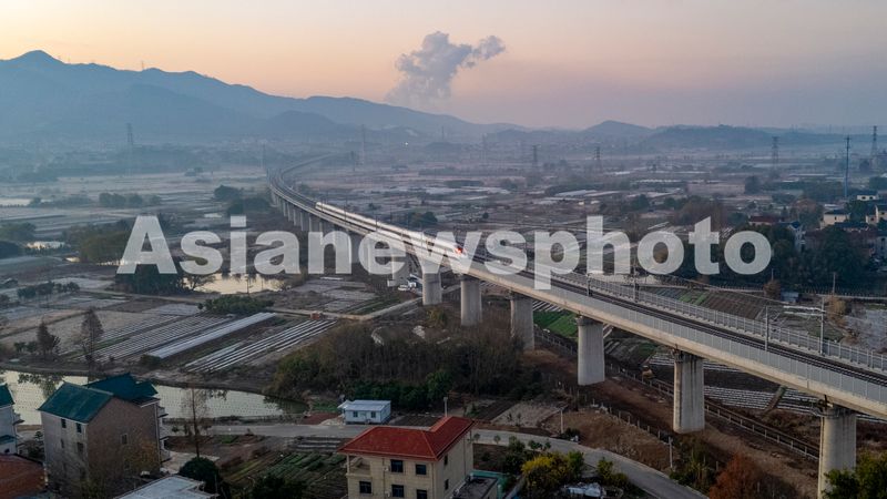 2025年12月26日,一列试运行列车行驶在金建高铁兰溪至建德段线路上。