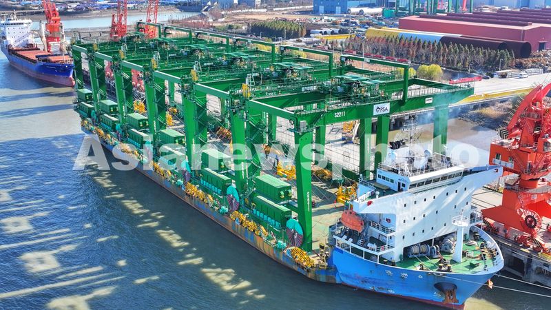 2025年12月26日,江苏省张家港港新重装码头一片忙碌,工人们正在装载国产自动轨道式龙门起重机。