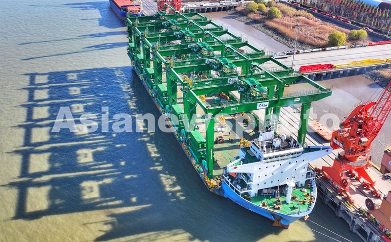 2025年12月26日,江苏省张家港港新重装码头一片忙碌,工人们正在装载国产自动轨道式龙门起重机。