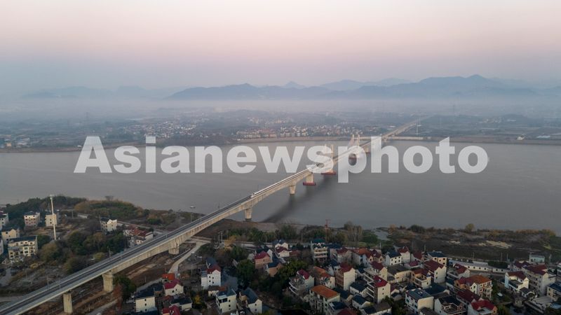 2025年12月26日,一列试运行列车行驶在金建高铁兰江特大桥上。
