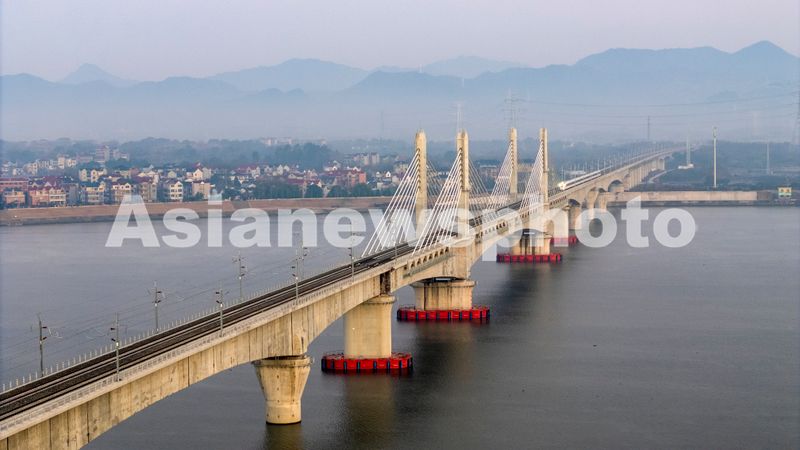 2025年12月26日,一列试运行列车行驶在金建高铁兰江特大桥上。