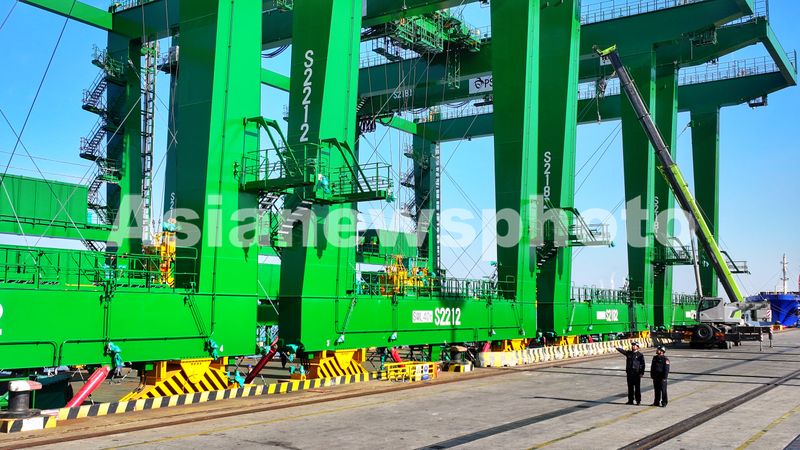 2025年12月26日,江苏省张家港港新重装码头一片忙碌,工人们正在装载国产自动轨道式龙门起重机。