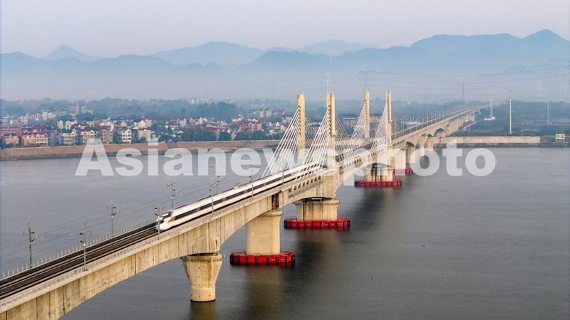 2025年12月26日,一列试运行列车行驶在金建高铁兰江特大桥上。
