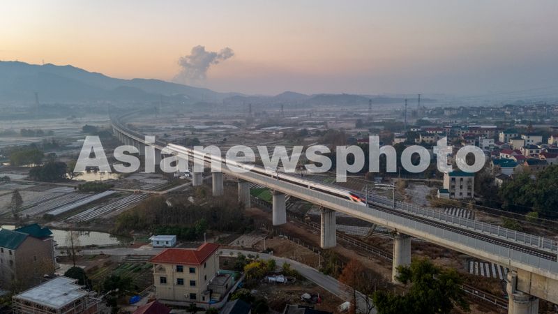 2025年12月26日,一列试运行列车行驶在金建高铁兰溪至建德段线路上。