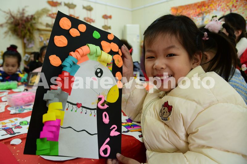 2025年12月29日,在江苏省镇江市解放路幼儿园,一名小朋友展示江苏大学志愿者指导她制作的迎新年主题手工作品。
