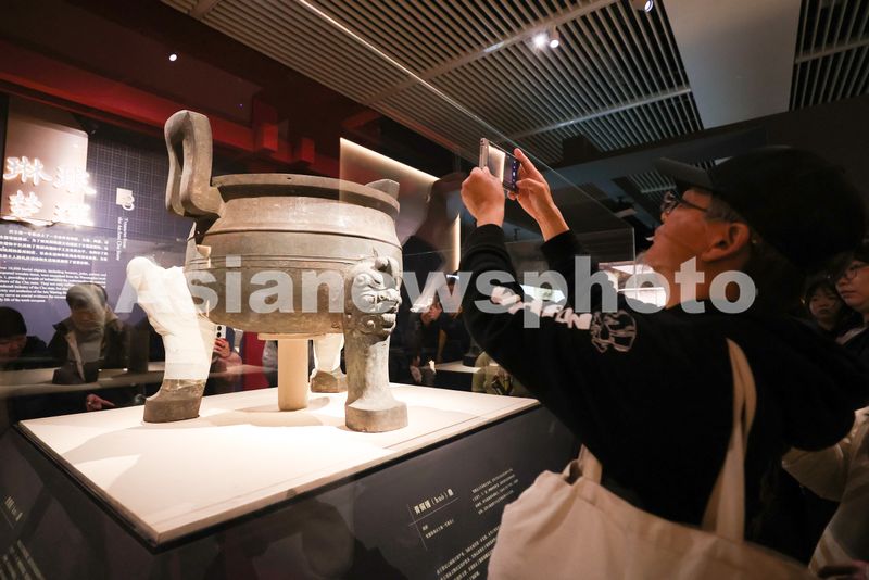2025年12月26日,观众在“遇见考烈王——安徽淮南武王墩一号墓考古成果展”上拍摄展出的青铜镬鼎。